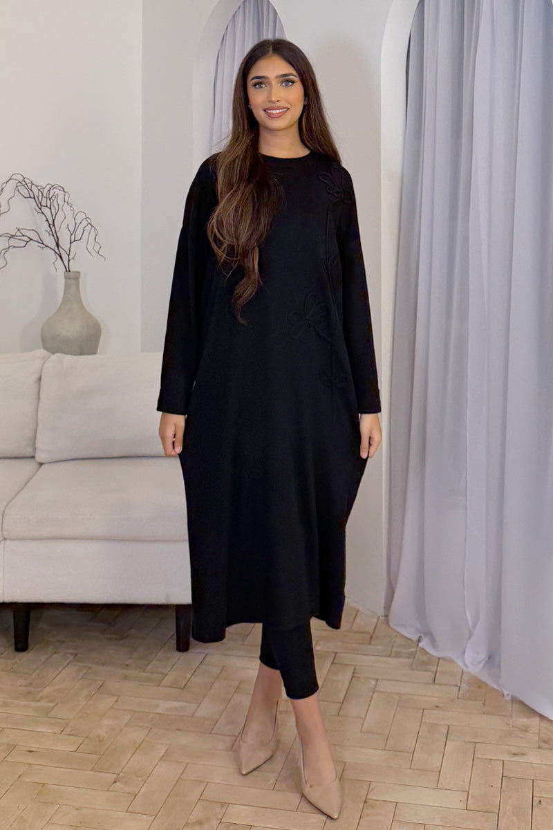 This midi dress is crafted from the same luxurious, cosy fabric as the coord set, featuring a delicate floral textured pattern that adds dimension and femininity to the silhouette. Designed to drape effortlessly, it offers both comfort and refined style — perfect for cooler days when you want to feel wrapped in elegance.