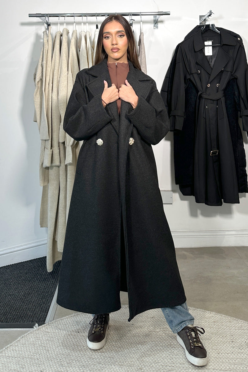 A softly structured trench-style coat designed for everyday elegance. Crafted from a warm, wool-like fabric, it drapes beautifully and feels as effortless as it looks. The folded lapel collar gives it that timeless, classic trench silhouette, while the two crushed gold buttons add a subtle, modern touch of luxury.