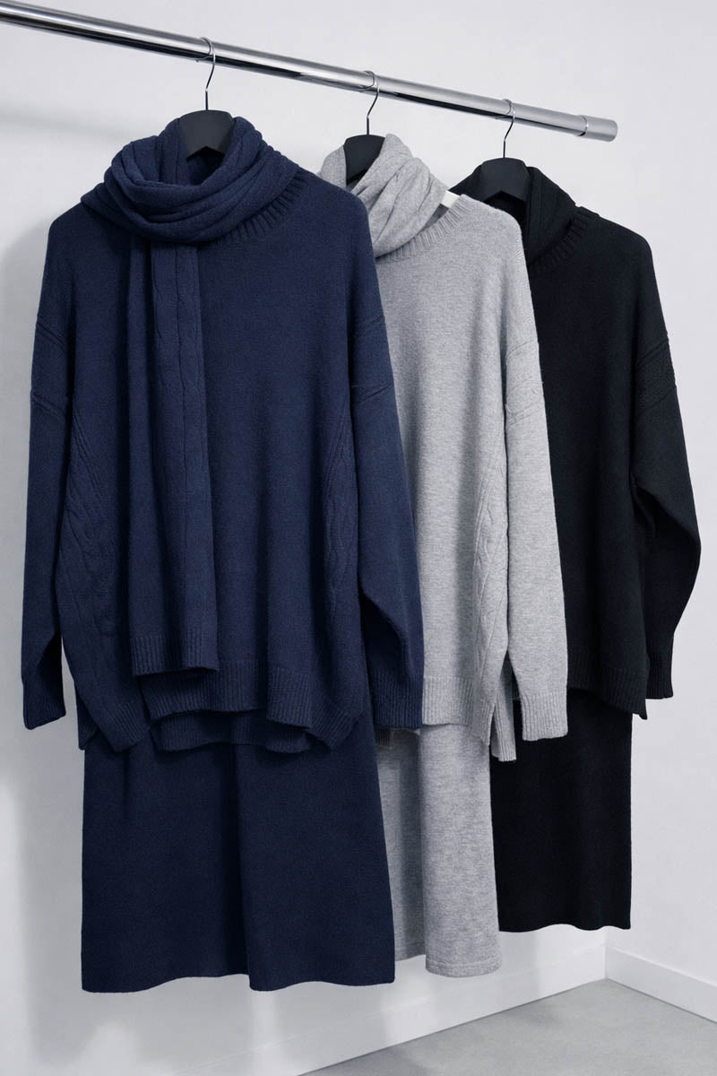 Finished with a beautifully soft matching scarf, also detailed with cable knit along the edges, this set delivers head-to-toe comfort without compromising on style. Perfect for lounging, or travel days.