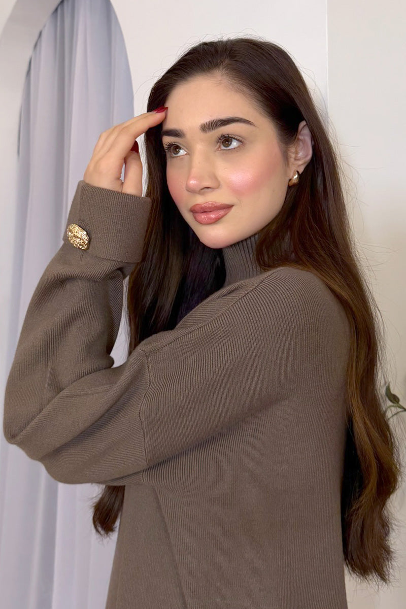 This refined coord set is crafted from a premium, knit fabric that offers structure without compromising on comfort. The top features a high neckline knitted seamlessly upwards — giving the illusion of a pullover, without the need to slip it over — for a clean, uninterrupted silhouette. Longline in shape, it’s finished with side slits for graceful movement and folded cuffs adorned with a crushed gold button, adding an understated touch of elegance.