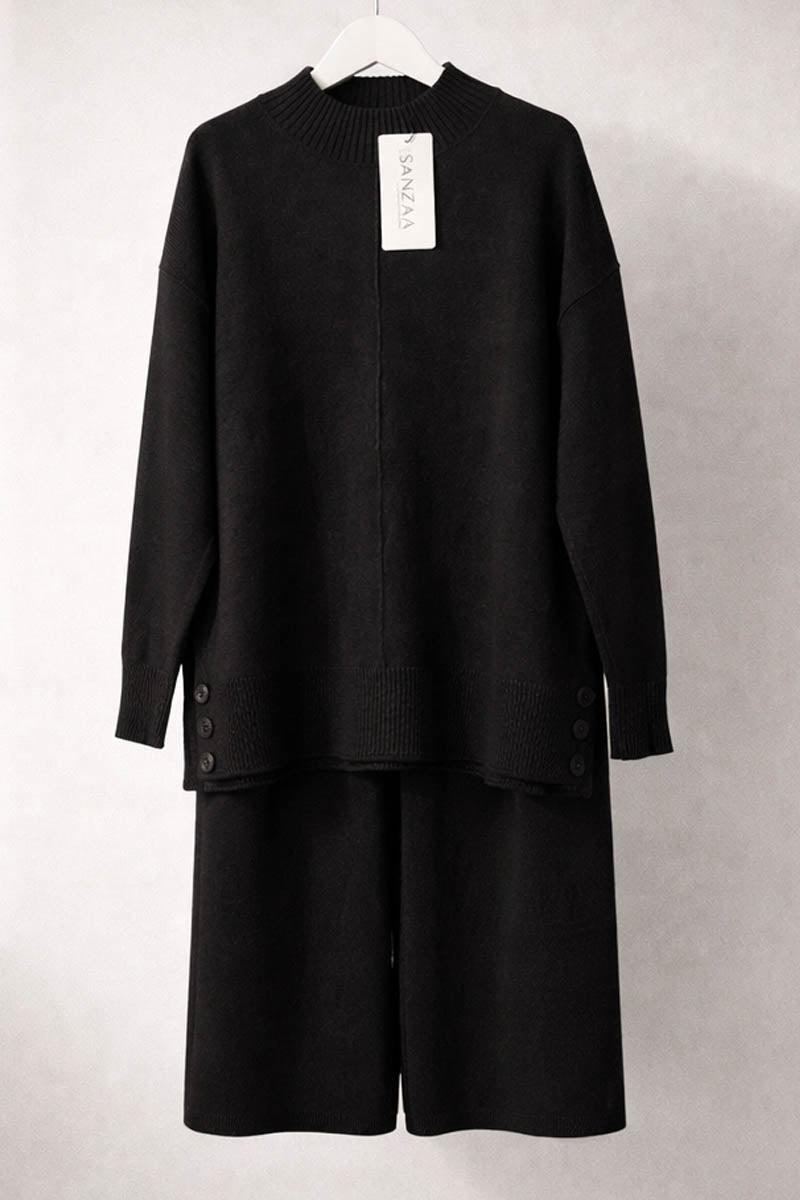 Effortless and elevated, this knit co-ord set is designed for everyday comfort with a polished finish. The top features a soft ribbed neckline and a central seam detail accented with three decorative buttons for a subtle statement. Small side slits add ease of movement and a flattering drape, while the relaxed silhouette keeps it modern and wearable.