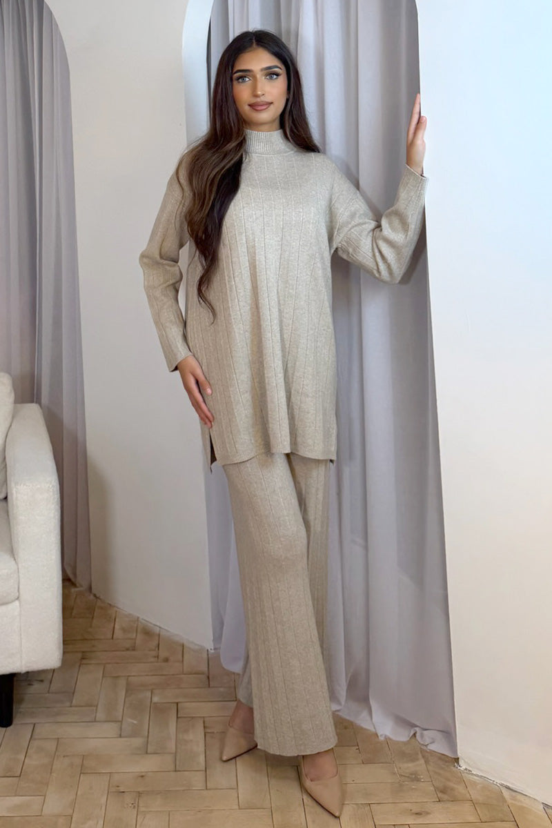 This coord set is crafted from a premium luxury fabric with a distinctive vertical folded line effect, adding dimension and a refined edge to the minimalist silhouette. The top features small side slits for graceful movement and an effortlessly flattering drape, making it ideal for both everyday polish and occasion layering.