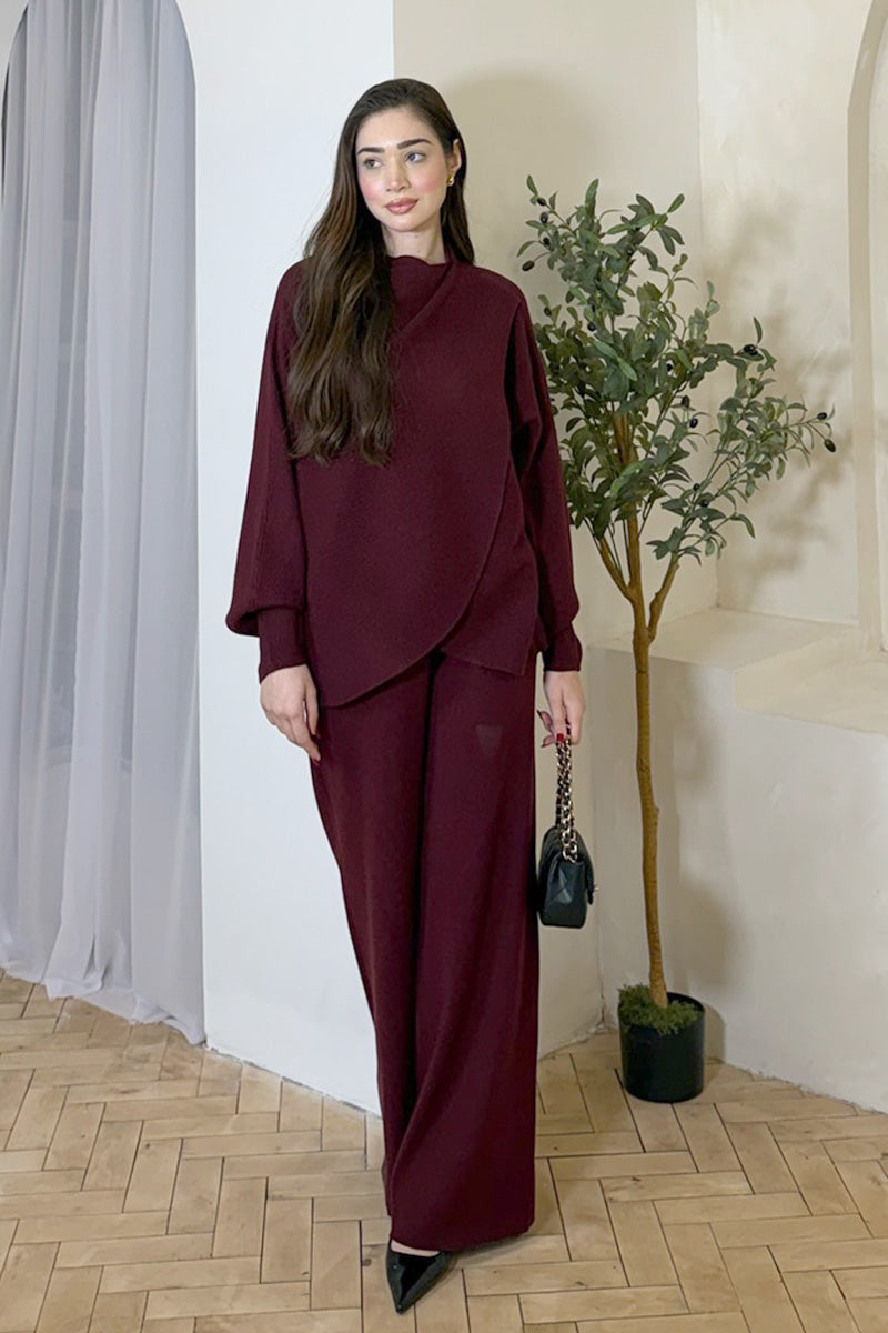 Crafted from premium fabric, this luxury coord set combines timeless design with elevated detail. The wrap-style top features a graceful layered crossover front, offering a flattering silhouette that flows effortlessly with movement. Paired with tailored wide-leg trousers, the ensemble delivers a poised yet relaxed statement — perfect for formal occasions or elevated everyday wear.