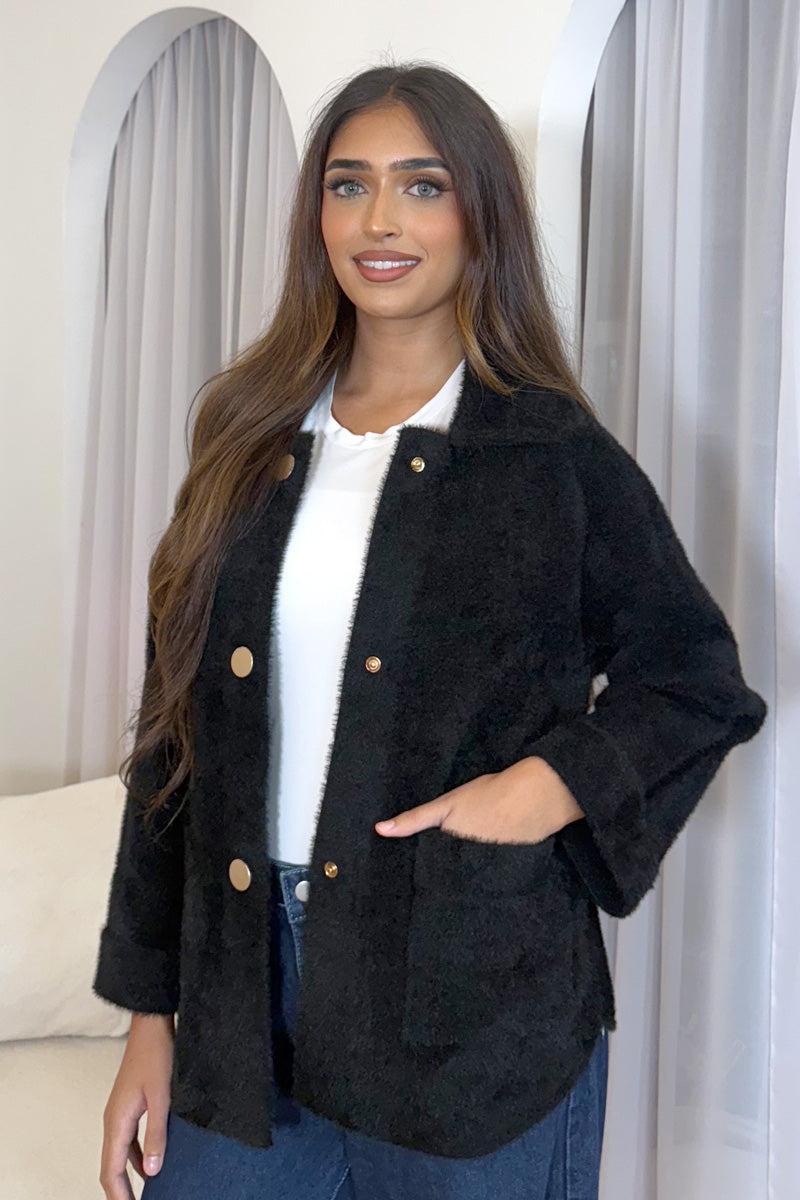 Made with the luxurious fuzzy material featured in our signature coatigan, this short jacket balances softness. Featuring a structured collar and neatly folded cuffs, it’s designed to elevate everyday layering with ease.