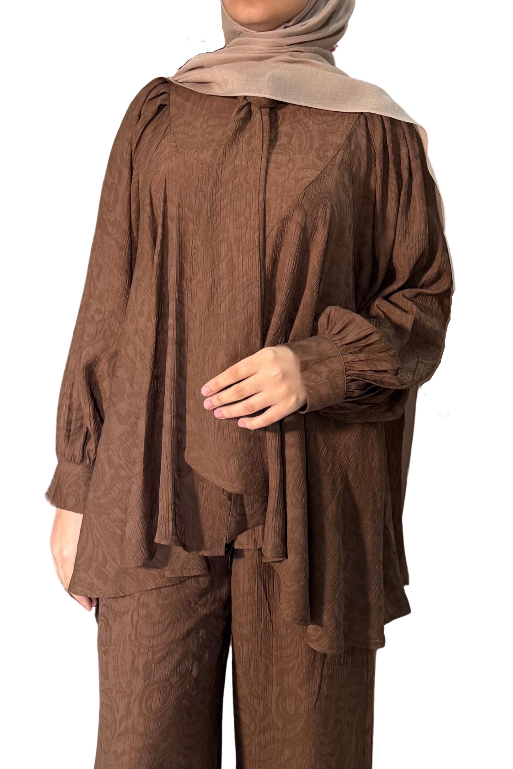 Elevate your everyday elegance with this beautifully tailored co-ord set, designed for effortless sophistication. Crafted from premium fabric featuring an embossed print woven directly into the material, the subtle texture and soft sheen add depth and dimension to the overall look.