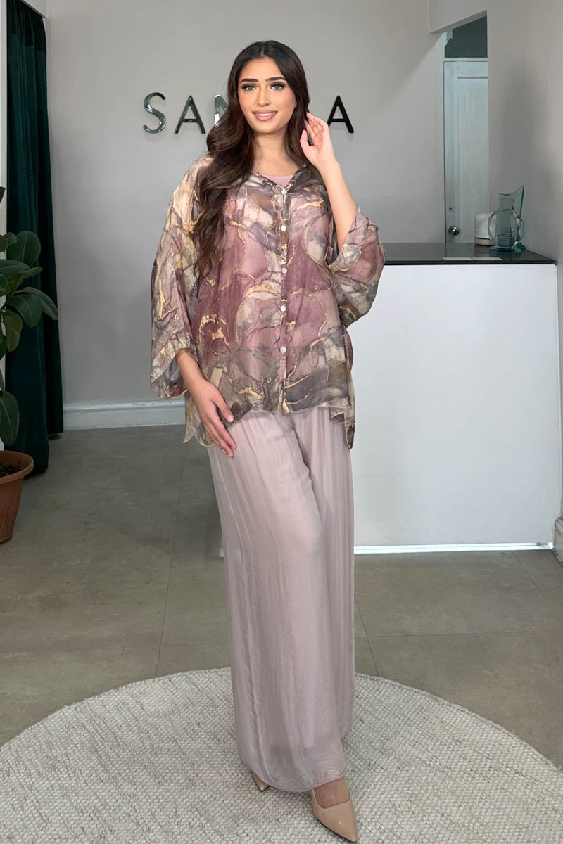Make a statement in soft swirls with this marble-effect co-ord, where comfort meets contemporary style. The set features a button-down top layered over a matching vest, offering versatile styling options. Paired with double-layered wide-leg trousers, designed with an easy elasticated waistband for all-day comfort and flowy movement. Effortlessly put-together and endlessly wearable, this set brings a modern, artistic edge to your wardrobe.