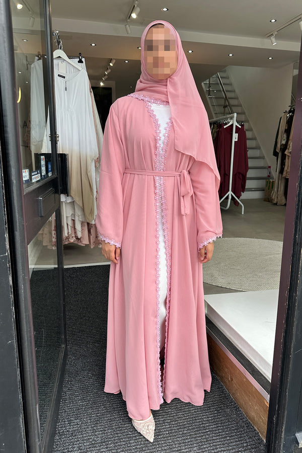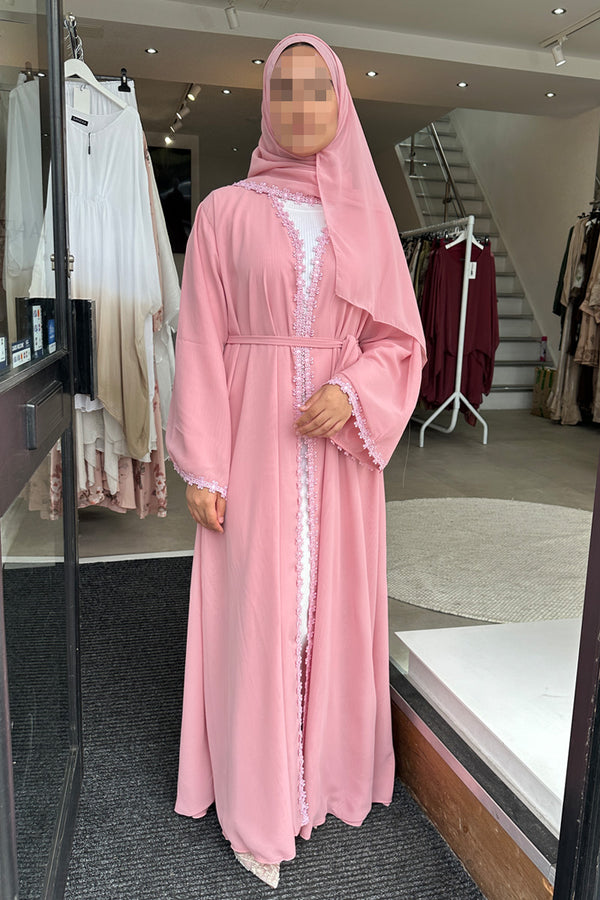 Elegant and effortlessly stylish, these straight-cut abayas are crafted from double-lined chiffon, offering a lightweight feel with full opacity. Designed with subtly flared sleeves, each abaya features a delicate floral lace detail that runs through the garment and along the...