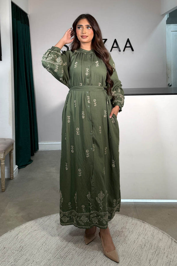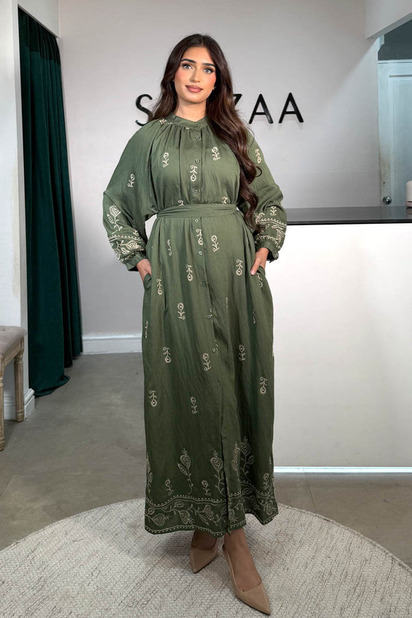 A graceful full-length dress featuring a neat grandad collar and soft pleating at the neckline. The button-down design offers versatility, while the attachable belt shapes the waist for a flattering fit. Finished with intricate embroidery in a darker tone, adding...