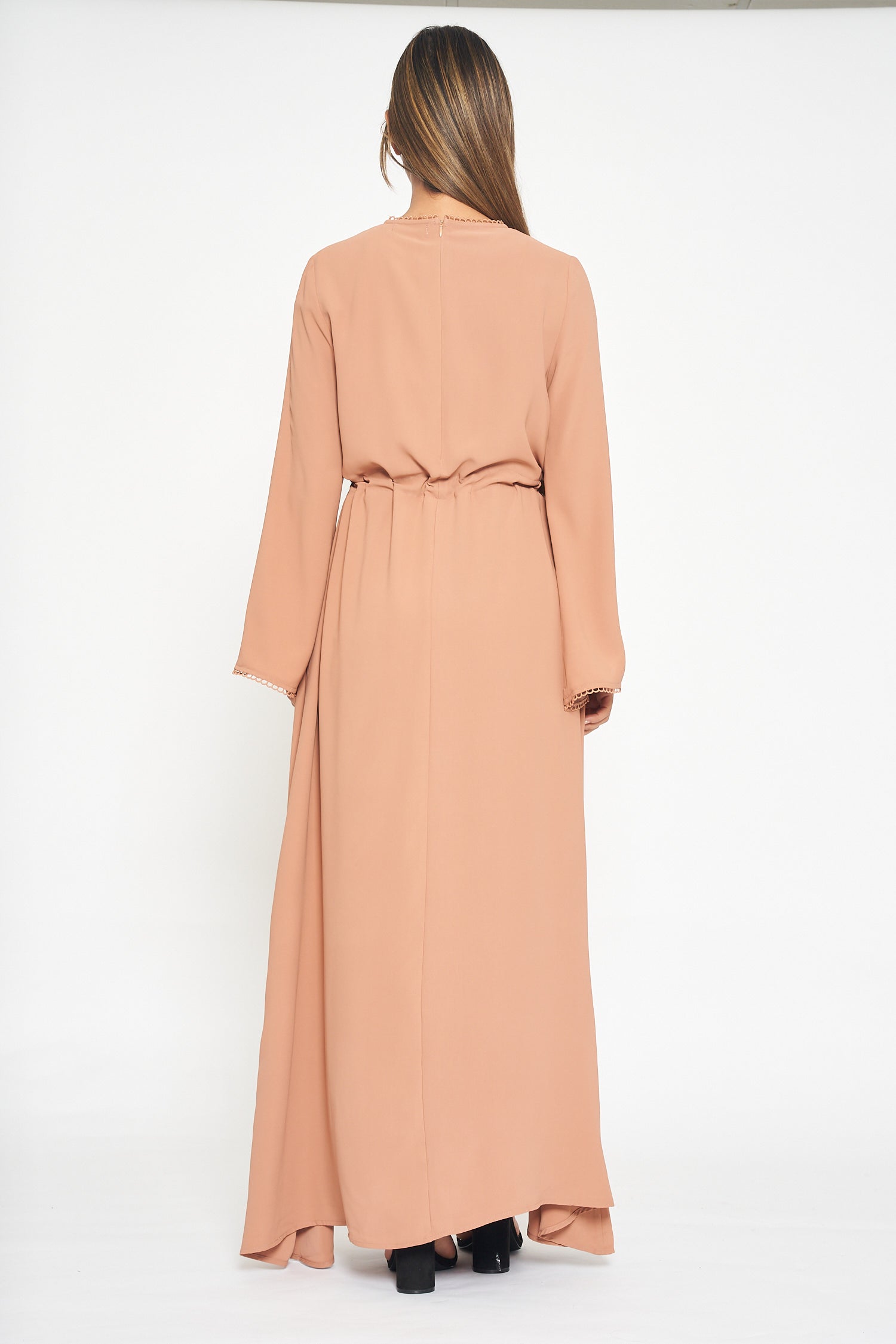 Get the look with this elegant A line maxi dress. Featuring a drawstring tie at the waist and inserted pockets, and a beautiful circle trim on neckline and sleeves.