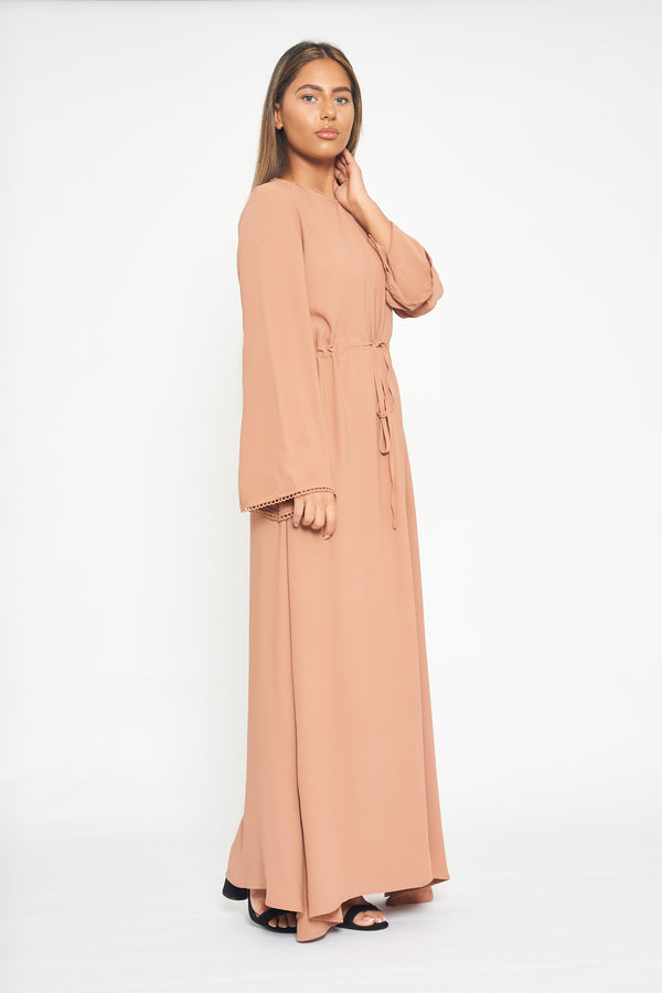 Circle Trim Maxi Dress - Salmon Get the look with this elegant A line maxi dress. Featuring a drawstring tie at the waist and inserted pockets, and a beautiful circle trim on neckline and sleeves. Length approx: 56 Inches Fabric:...