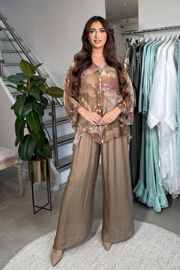 Make a statement in soft swirls with this marble-effect co-ord, where comfort meets contemporary style. The set features a button-down top layered over a matching vest, offering versatile styling options. Paired with double-layered wide-leg trousers, designed with an easy elasticated...