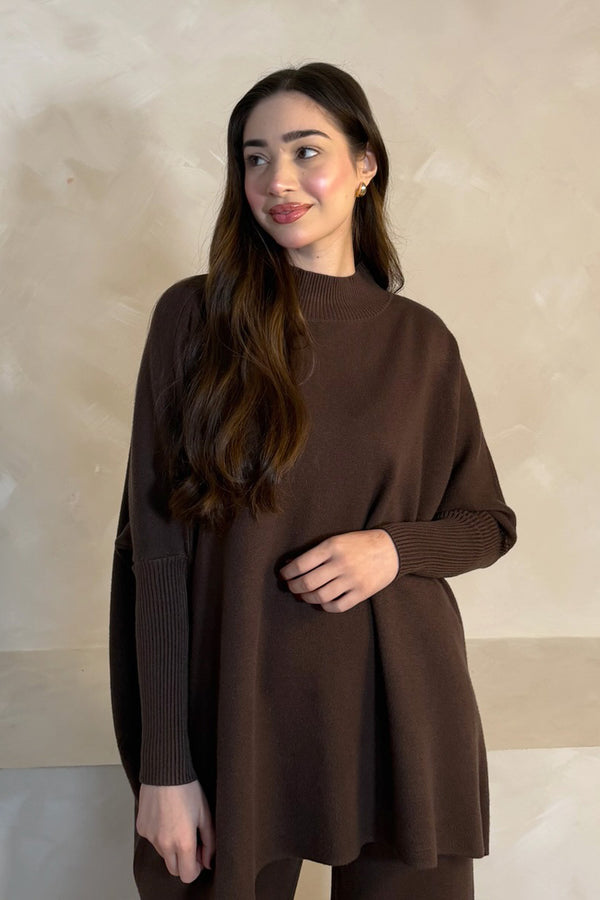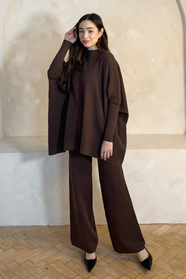 This effortless coord set features a poncho-style top designed in a fluid, soft-touch knit that drapes beautifully over the body. The wide-cut shape is balanced by ribbed 3/4-length fitted cuffs, adding gentle structure to the relaxed fit. Thoughtfully paired with...