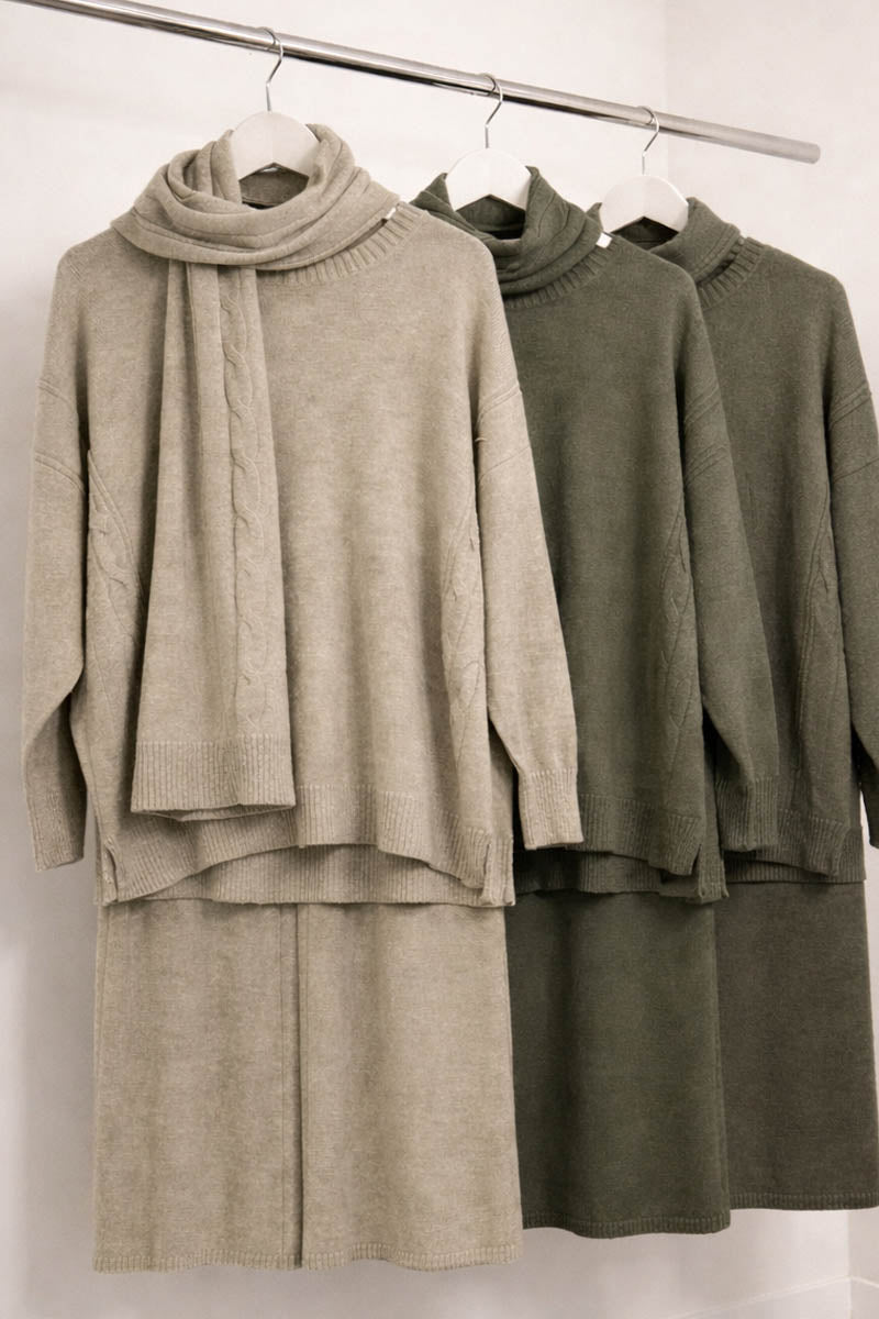 Finished with a beautifully soft matching scarf, also detailed with cable knit along the edges, this set delivers head-to-toe comfort without compromising on style. Perfect for lounging, or travel days.