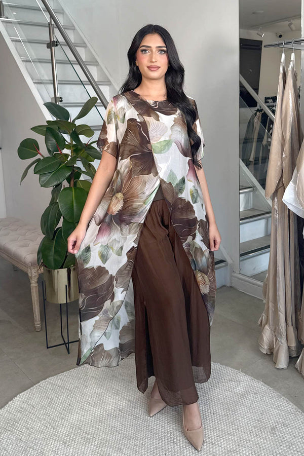 Flowing elegance with a modern twist—this co-ord set is crafted from a luxe fabric blend with 30% silk, giving it a soft sheen and effortless drape. The short-sleeve top features a longline silhouette with a striking front split, revealing the...