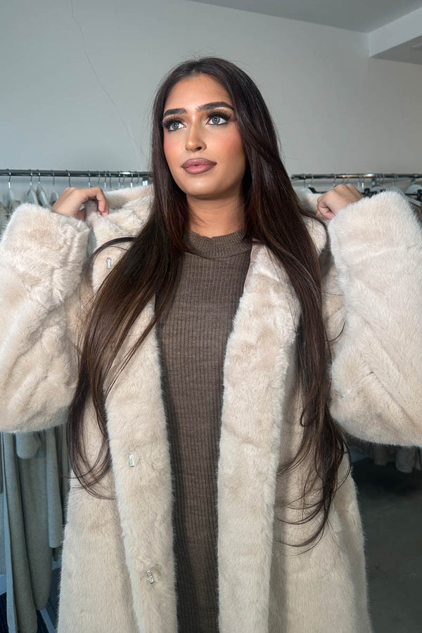 Wrap yourself in moonlit elegance.The Mahsa Fur Coat embodies refined luxury, crafted from ultra-soft, high-quality faux fur that feels as indulgent as it looks. Designed in a warm beige hue that flatters every skin tone, this coat features a graceful...