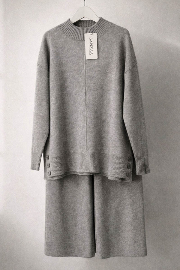Effortless and elevated, this knit co-ord set is designed for everyday comfort with a polished finish. The top features a soft ribbed neckline and a central seam detail accented with three decorative buttons for a subtle statement. Small side slits...