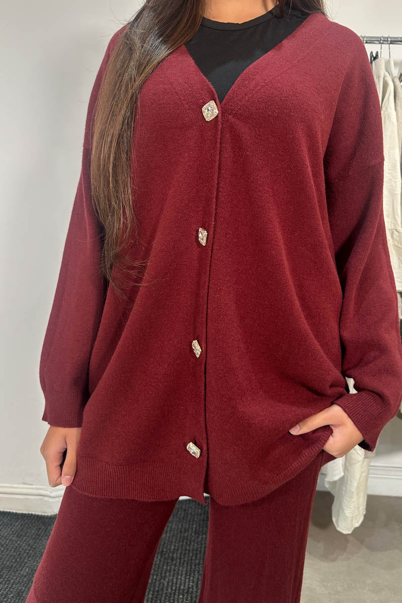 Elevate your wardrobe with this glamorous co-ord set, designed for the woman who loves refined sparkle. The cardigan-style top features shimmering diamanté button fastening, adding a touch of luxe to its clean silhouette. Paired with perfectly matching trousers, this set delivers a polished, coordinated look that transitions beautifully from day to evening.